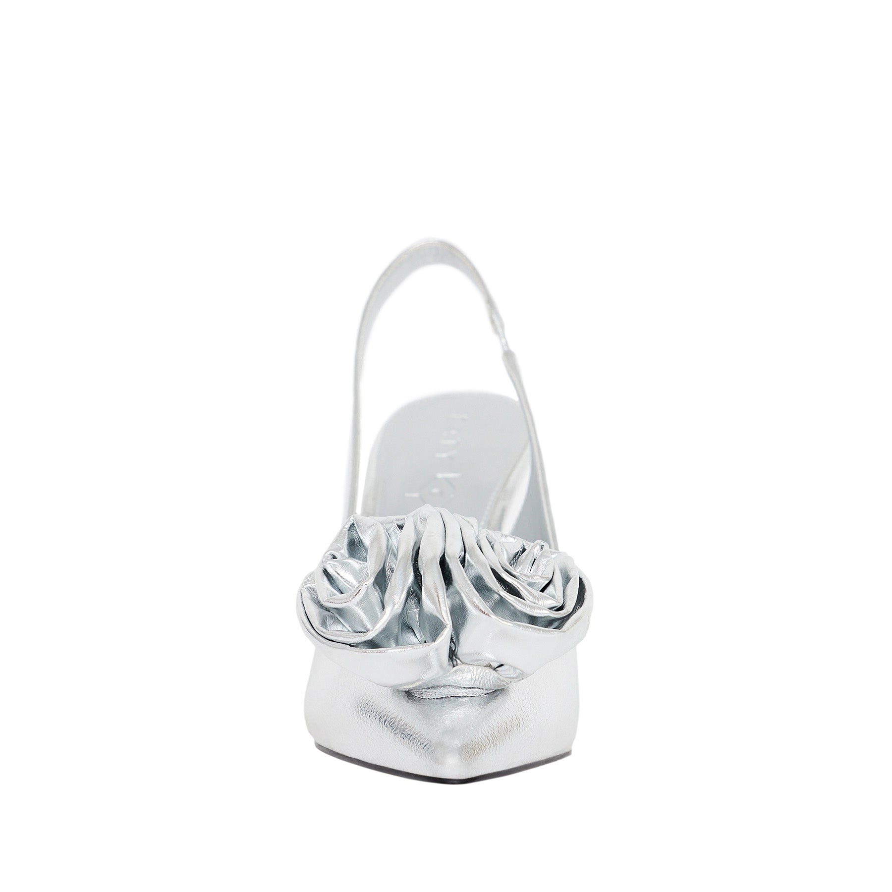 Add a touch of elegance to your ensemble with the Laterr High Flower by Katy Perry, crafted from beautiful Metallic Softy Nappa, adorned with a charming rosette flower detail on top, and finished with a flattering flared heel.